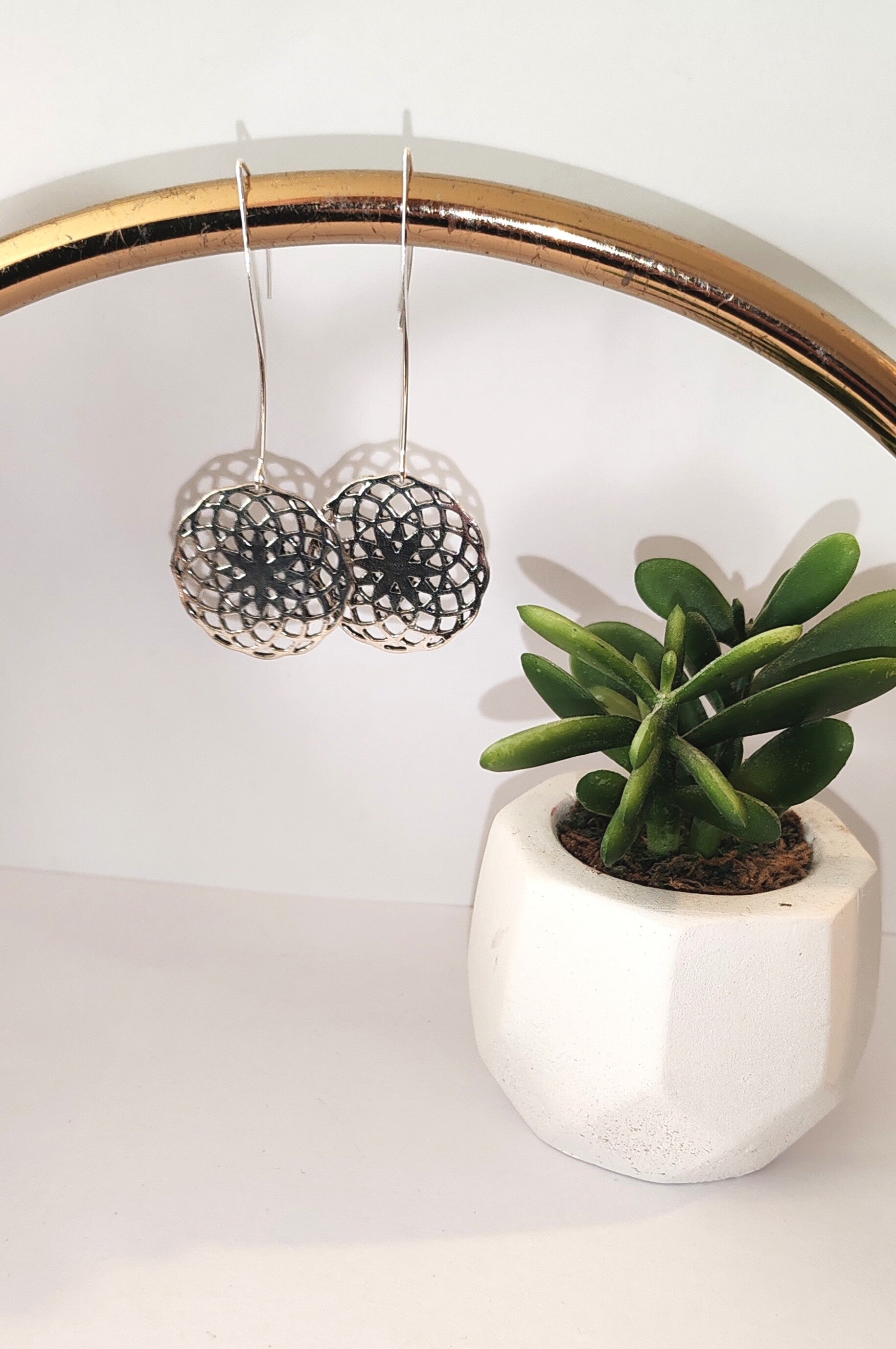 Boucles d'oreilles Graine de vie argenté, montées sur tige acier inoxydable.
