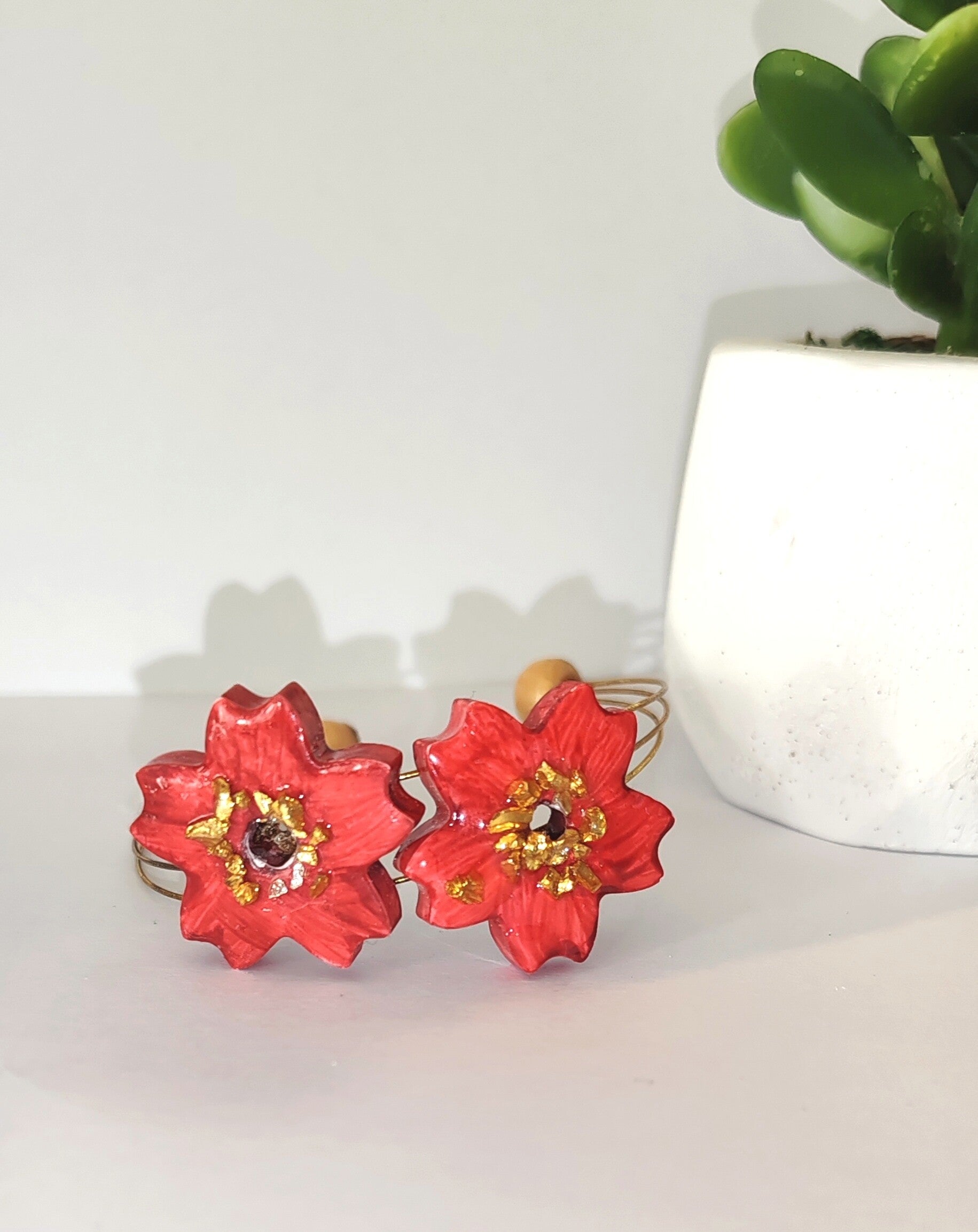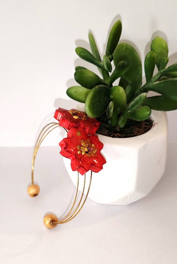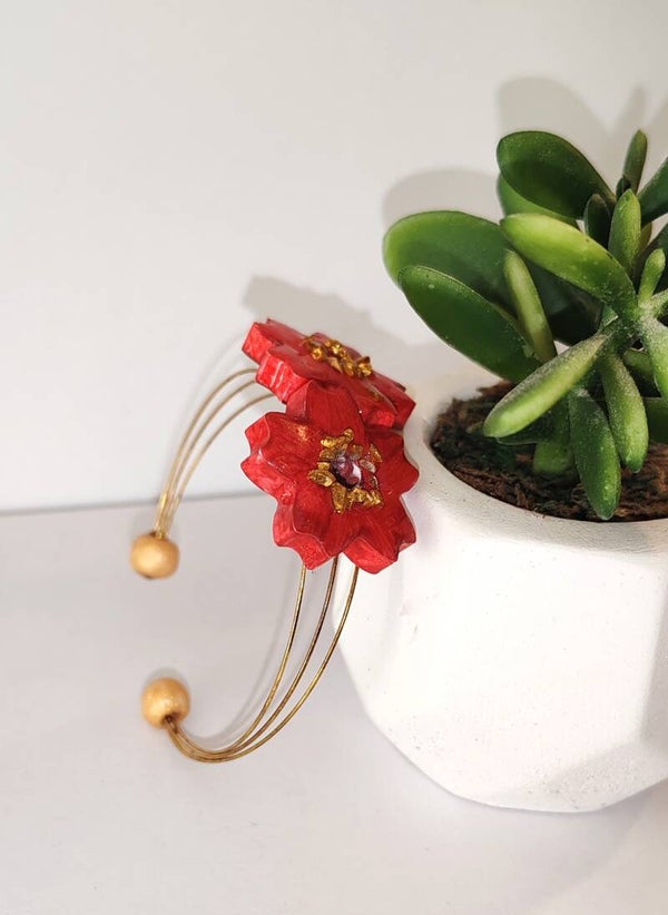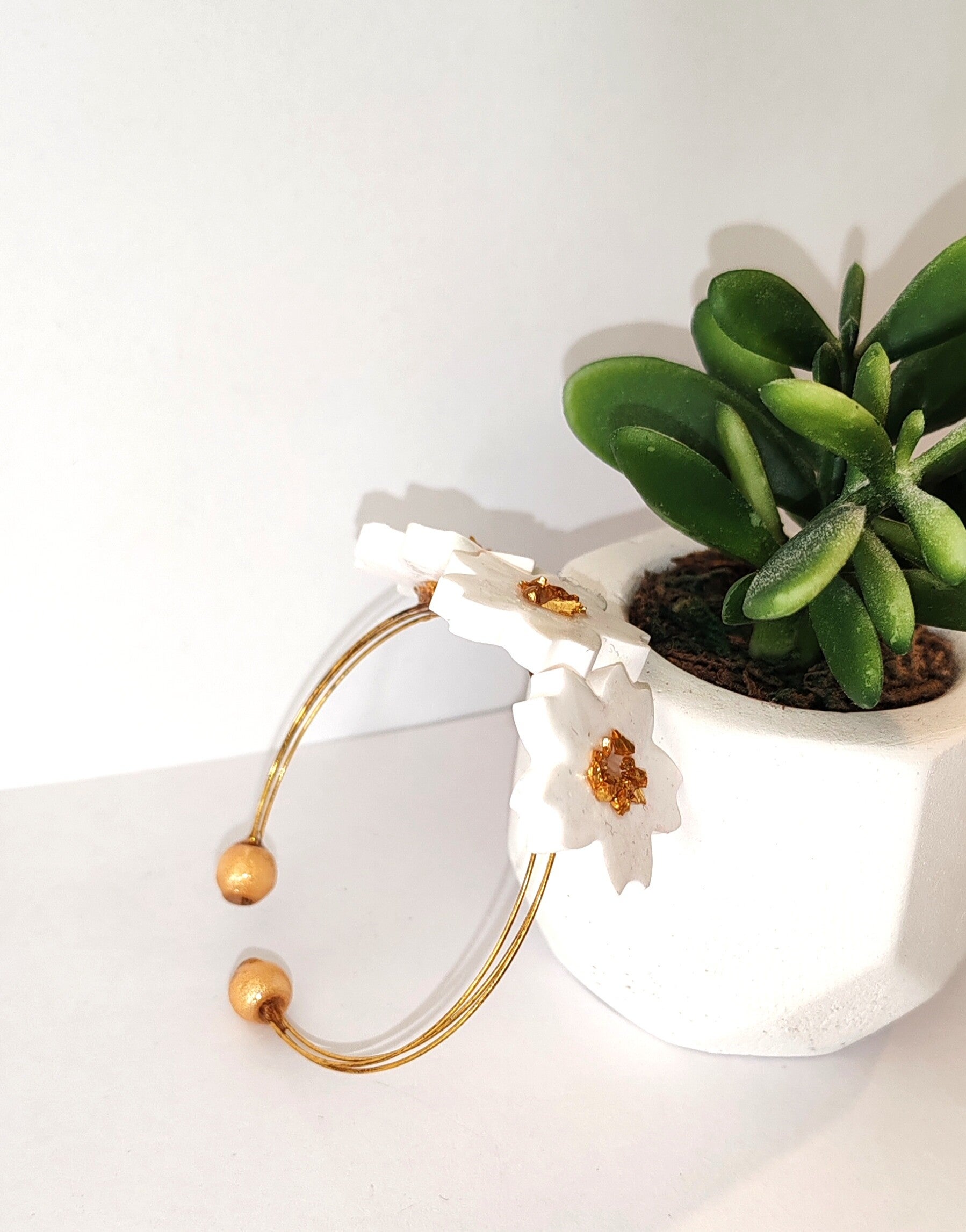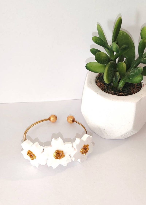 Bracelet fleur de Sakura, en plâtre céramique, peint à la main, incrustaion micro pierre dorée et finition couche de résine cristal.
