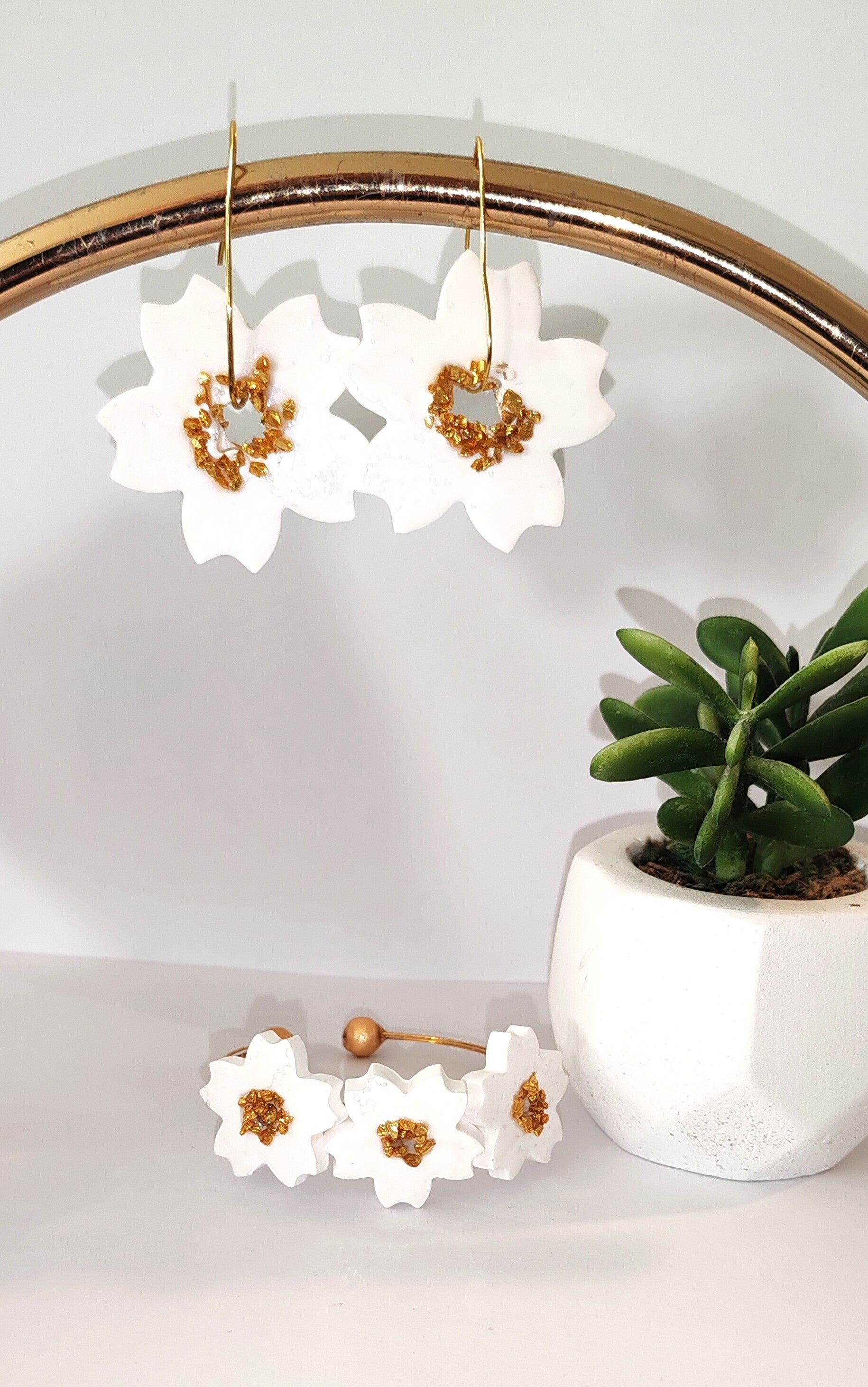 Ensemble Bracelet+ boucles fleur de Sakura, en plâtre céramique, peint à la main, incrustaion micro pierre dorée et finition couche de résine cristal.
